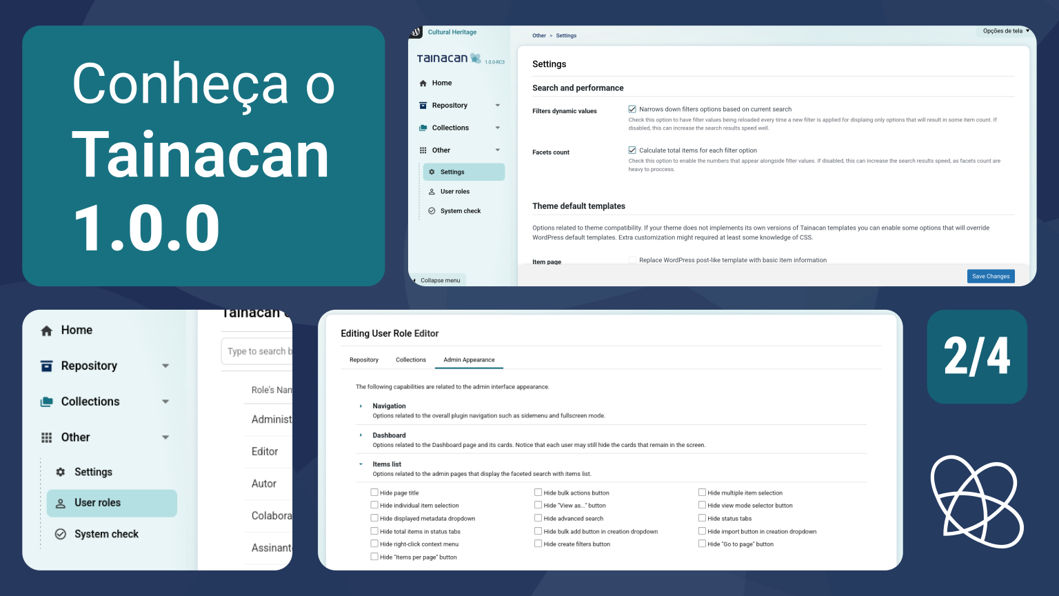 Neste artigo abordaremos um dos aspectos mais relevantes da versão 1.0.0 do Tainacan: a customização. No artigo anterior mostramos como usuários podem modificar seu painel inicial para atender às suas preferências de navegação. Agora queremos voltar nossa atenção para gestores e administradores que desejam ter maior controle sobre como o plugin se comporta e como estas funcionalidades chegam ao usuário. Falamos disso cobrindo dois novos recursos, a nova Tela de Configurações do Plugin e as novas opções de Ajustes de Aparência por Função de Usuário.
